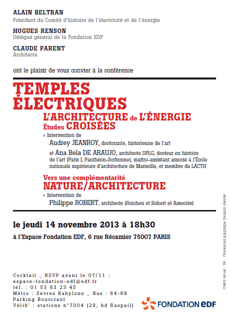 La Fondation EDF organise la Conférence Temples Electriques L’Architecture de l’Energie. Cette conférence aura lieu le 14 novembre 2013 à 18h30, à l’Espace Fondation EDF, 6 rue Récamier, 75007 Paris.