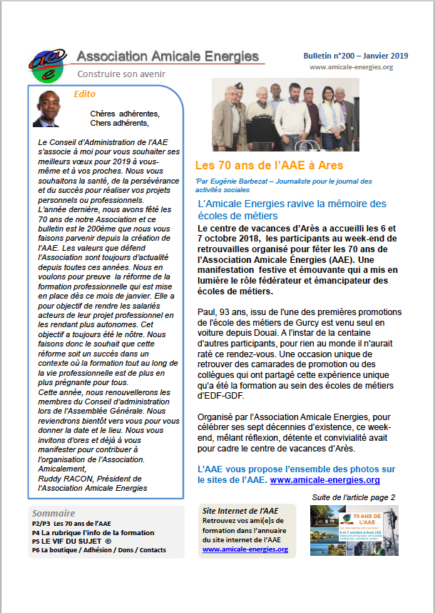 – Les 70 ans de l’AAE– Amicale Energies ravive la mémoire des Ecoles de métiers– Les 7 grandes nouveautés de la réforme de la formation professionnelle– LE VIF DU SUJET ©, L’hypnose Ericksonnienne